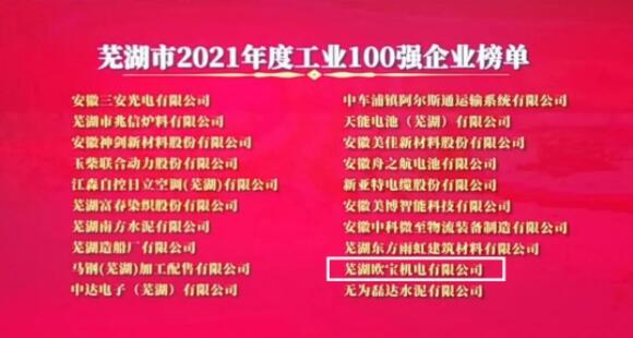 在會議中,市企聯(lián)執(zhí)行會公布了“蕪湖市2021年工業(yè)企業(yè)百強(qiáng)”、“商貿(mào)服務(wù)業(yè)企五十強(qiáng)”、“農(nóng)業(yè)企業(yè)三十強(qiáng)”、“建筑業(yè)企五十強(qiáng)”等多項(xiàng)榜單。蕪湖歐寶機(jī)電有限公司名列其中,成功入選“2021年度蕪湖市工業(yè)百強(qiáng)企業(yè)”。歐寶公司獲此殊榮,是市政府對歐寶公司的肯定與鼓勵,也標(biāo)志著歐寶公司通過不斷努力,在企業(yè)發(fā)展、社會效益、綜合實(shí)力方面不斷邁上新臺階。